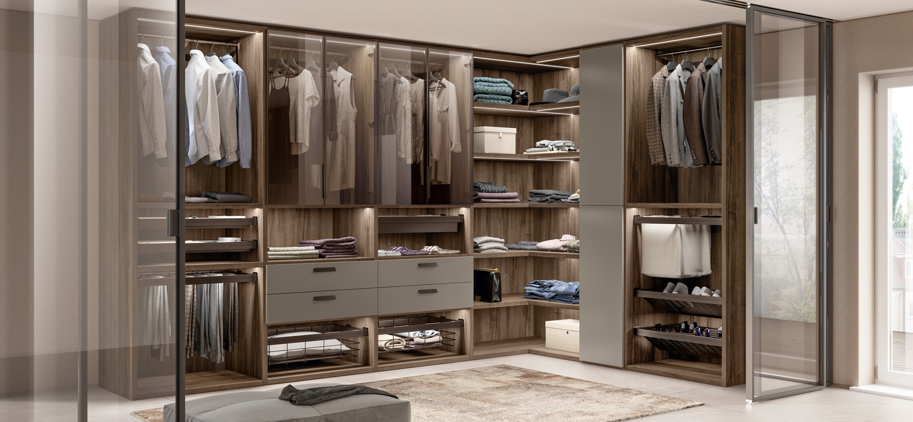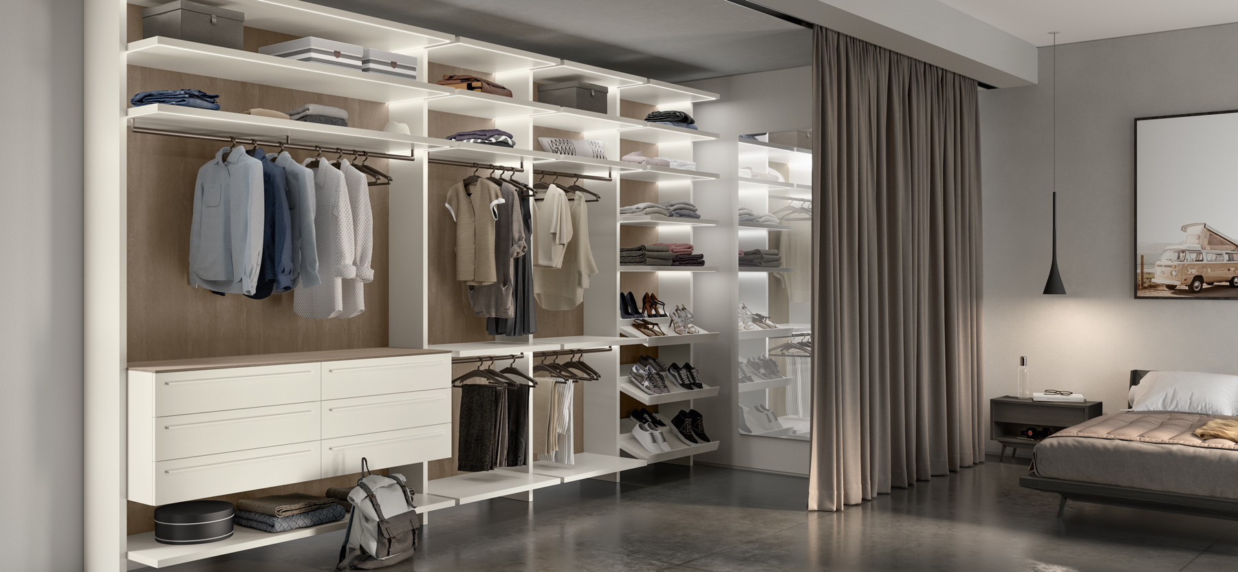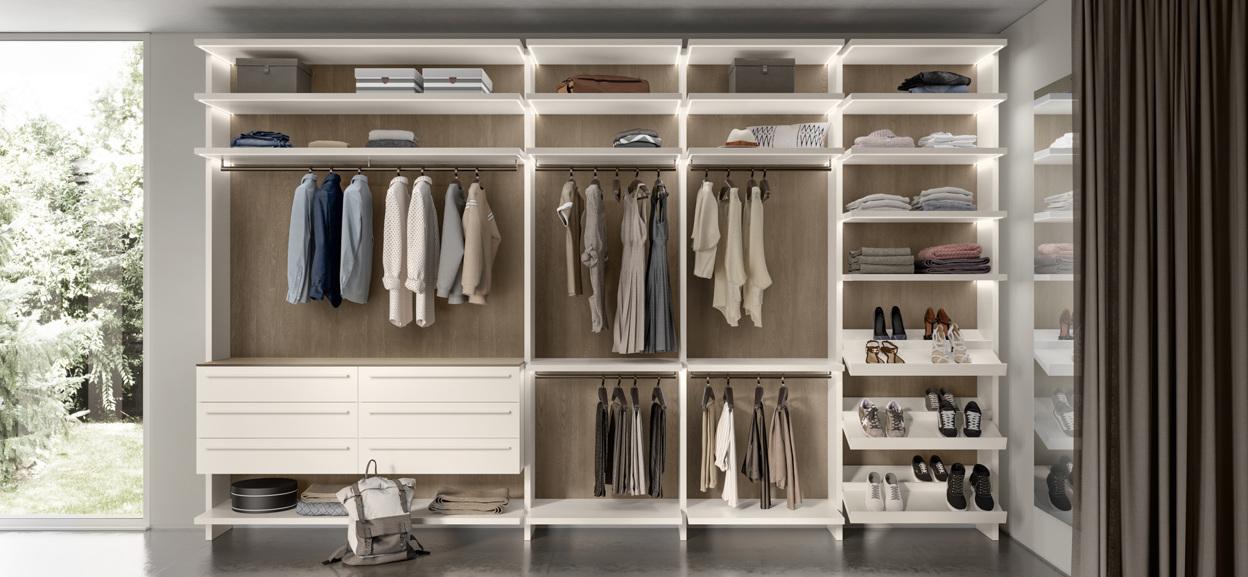 È possibile realizzare progetti Walk-in Fluida lineari, angolari, con moduli a vista (come una scenografia da fashion addict) o chiusi (per chi ama l’ordine), fino alla creazione di soluzioni free standing, pensate come veri e propri separatori d’ambiente.