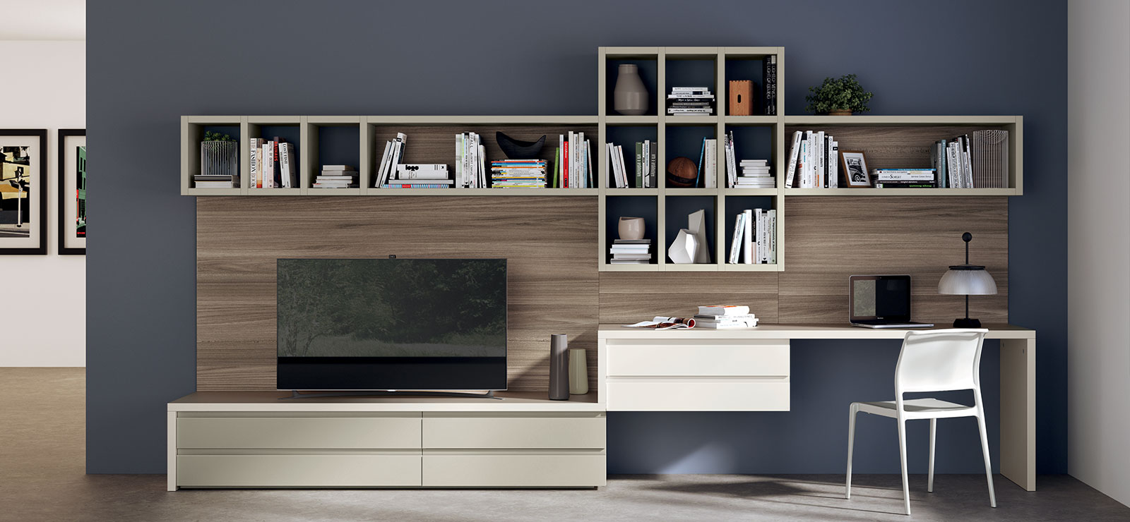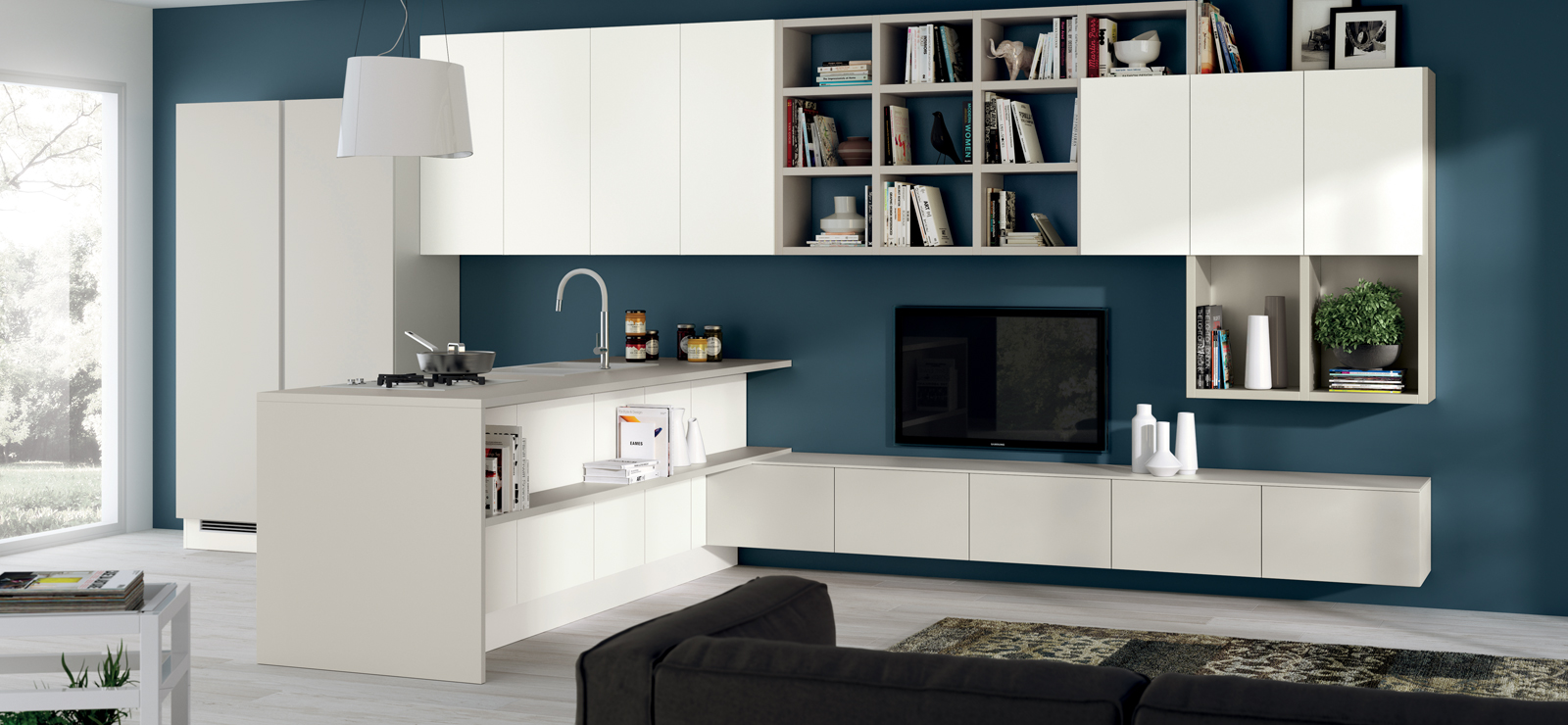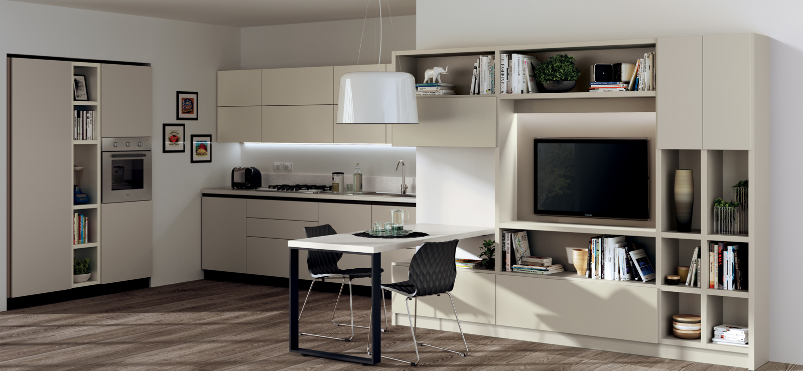 Per la polifunzionalità di un unico ambiente, per avere tutto a portata di mano, per far convivere operosità e relax, uso e consumo, perfetto equilibrio di contrasti.